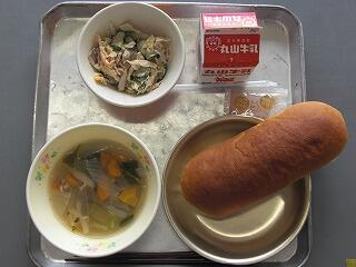 今日の献立は、キャロットパン、牛乳、チキンチキンゴボウ、わかめスープでした。