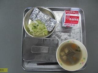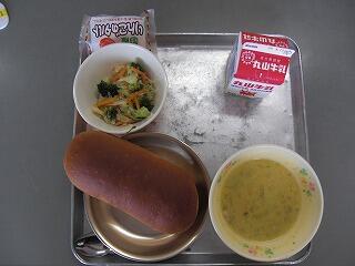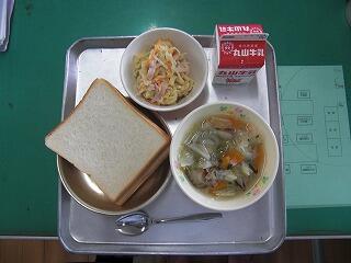 今日の献立は、食パン、牛乳、サラダパン、肉団子スープでした。
