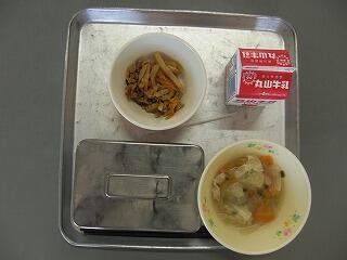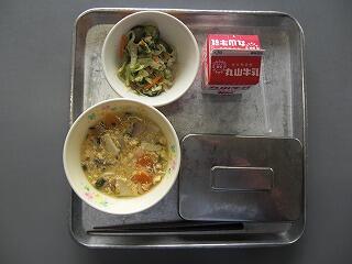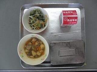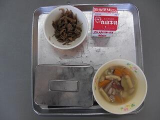 今日の献立は、ご飯、牛乳、ごもくきんぴら、いものこ汁でした。