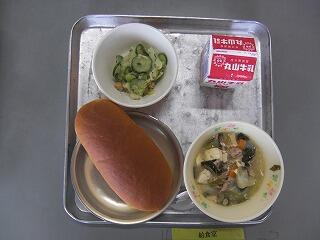 今日の献立は、ごはん、牛乳、いりどうふ、くきわかめのすのものです。