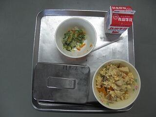 今日の献立は、「牛乳」「ご飯」「おかか和え」「いりどり」でした。