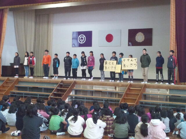 2月23日(火)の朝の時間に27年度最後の児童集会を行いました。今回は運営委員会の発表でした。楽しい寸劇を通して「あいさつ日本一の学校」を目指していくことをみんなで確認しました。今年は、「あいさつ日本一の学校」を目指して、あいさつマンデーや地区の方にアンケートをとるなど、様々な取り組みをしてきました。「あいさつ日本一の学校」を目指して、さらにみんなで頑張っていきます。