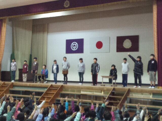 2月16日(火)の朝の時間に27年度最後の発表集会を行いました。今回は1年生と6年生の発表でした。1年生は、三角巾とエプロン姿で「わくわくキッチン」の合唱、6年生は卒業式の歌「絆」「Stand Alone」の2曲をそれぞれ発表しました。鑑賞していた他の学年からの児童から「とてもよかった。」という感想の発表もありました。1年生も6年生もみんな一生懸命発表することができました。