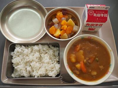 今日は、みんな大好きカレーライスとフルーツナタデココです。給食室からカレーのいいにおいがしてくると、「やった!今日はカレーだ!」「おなかすいた~!」と子どもたちもお昼の給食時間を楽しみにしているようでした。また、今日のカレーライスは特別にラッキー人参が入っていたので給食時間はどのクラスでも子どもたちがうれしそうに過ごしていました。