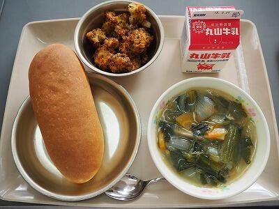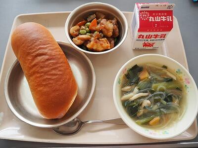 今日は、ほんのり紫色が特徴のいもっこパンです。いもっこパンには、紫芋の粉が練り込まれ、いつもと違うパンに子どもたちも「紫色だ~!」と喜んで食べていました。また、チキンチキンごぼうとは、山口県の給食で大人気メニューの一つです。油で揚げたとり肉とごぼうに青豆や人参を加え、甘辛いタレを絡めたものです。タレの甘さでごぼうが苦手な子どもたちにも食べやすいようで岡富小学校でも大好評でした。