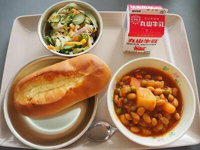 豆には、みなさんの体の筋肉や血を作ったり、体を丈夫にする栄養素があり、お腹の中をきれいにする働きもあります。豆の種類もいろいろあります。「あずき・だいず・白いんげん豆・そら豆・黒豆・えんどう豆・・・」。今日は、ひよこ豆を使った給食です。苦手な人もいるかもしれませんが、自分の体のために、がんばって食べましょう。