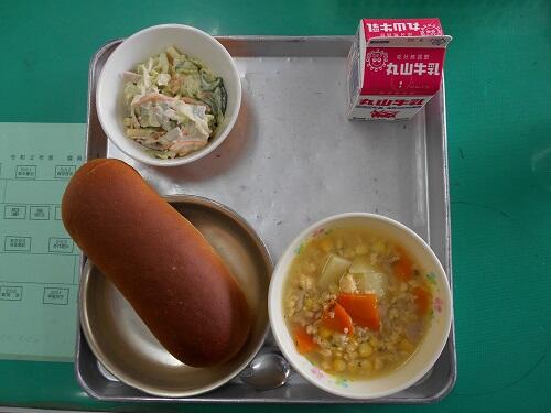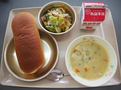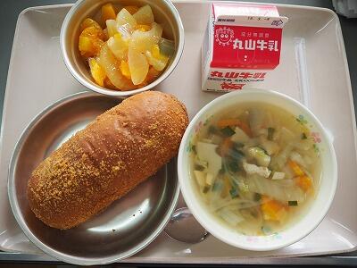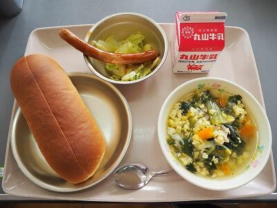 今日の献立は、「牛乳」「黒糖パン」「マカロニサラダ」「ふわふわスープ」でした。