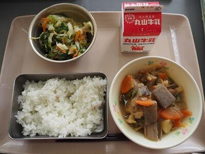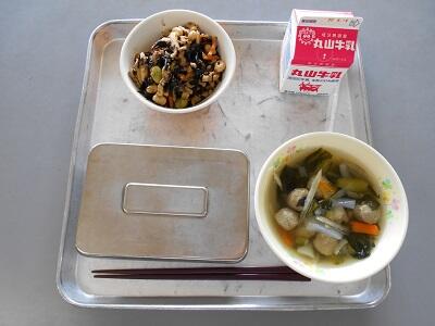 今日の献立は、「牛乳」「ご飯」「ひじきのいり煮」「あじのつみれ汁」でした。