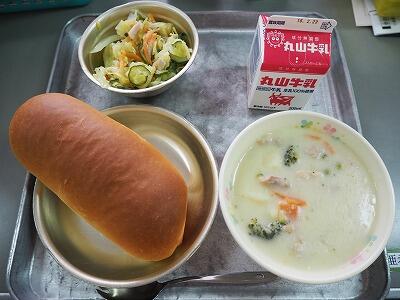 今日の献立は、「牛乳」「減量コッペパン」「パインサラダ」「カレーうどん」でした。