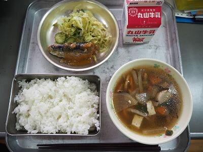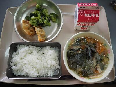 今日の献立は、「牛乳」「ご飯」「鰯の生姜煮・かりかり和え」「はちはい汁」でした。