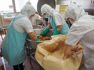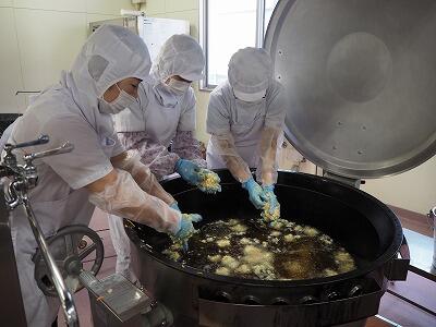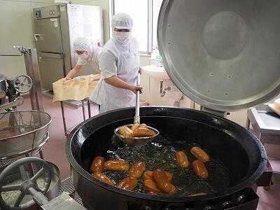 パン屋さんからパンが運ばれてきたら、給食室の油の入った釜でこんがりと揚げていきます。