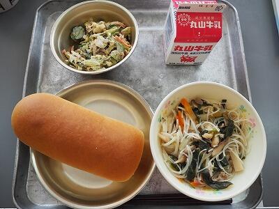 今日の献立は、「牛乳」「減量コッペパン」「青豆サラダ」「炒めビーフン」でした。