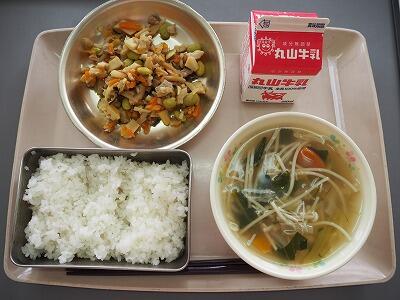 今日の献立は、「牛乳」「ご飯」「五目きんぴら・味付け海苔」「すまし汁」でした。