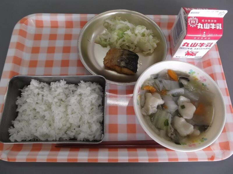 12月3日(木)献立:ごはん 牛乳 さばのみぞれに ゆできゃべつ すいとん