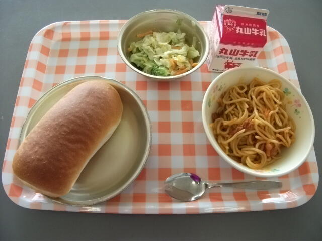 12月17日(金)献立:げんりょうコッペパン 牛乳 シーザーサラダ せん切りダイコンのミートスパゲティー
