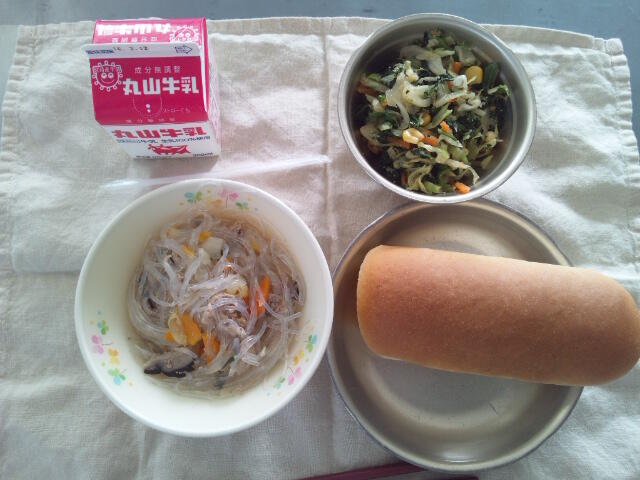 1月15日(金)献立:げんりょうコッペパン 牛乳 マヨネーズあえ ごもくうどん