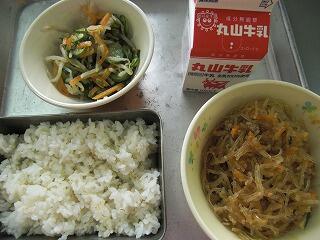今日の給食は、牛乳、ごはん、ぶたにくとあつあげのみそに、ごまずあえ、です。