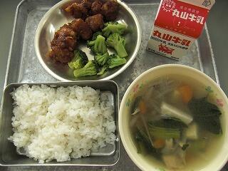 今日の給食は、牛乳、ごはん、とりのからあげ、そえやさい、とうにゅうみそしる、です。