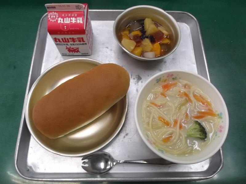 11月13日(金)献立:プチコッペパン 牛乳 とうにゅうクリームパスタ フルーツカクテル