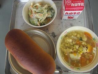 今日の給食は、牛乳、パン、ふわふわスープ、マカロニサラダ、です。