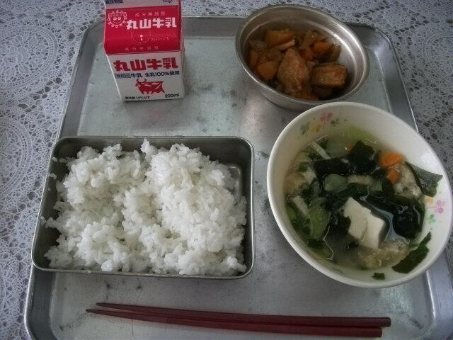 5月7日(木)献立:ご飯 牛乳 とりにくとあつあげのみそに せんぎりだいこんのすのもの