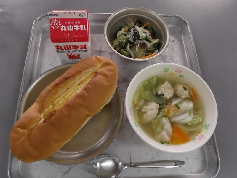 6月10日(水)献立:ごはん 牛乳 ちゅうかスープ あげぎょうざ きゅうりのしおもみ