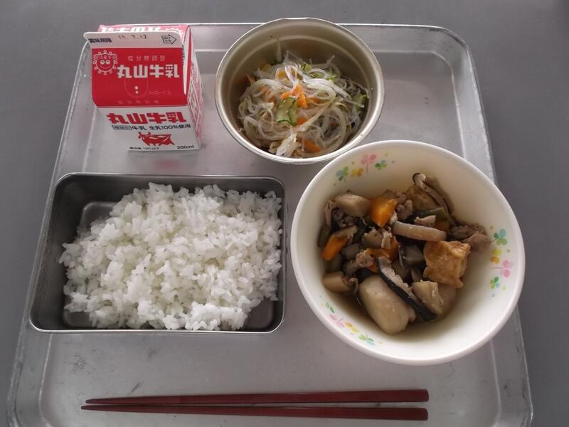 7月6日(月)献立:ごはん 牛乳 はるさめのすのもの ぶたにくとあつあげのにもの