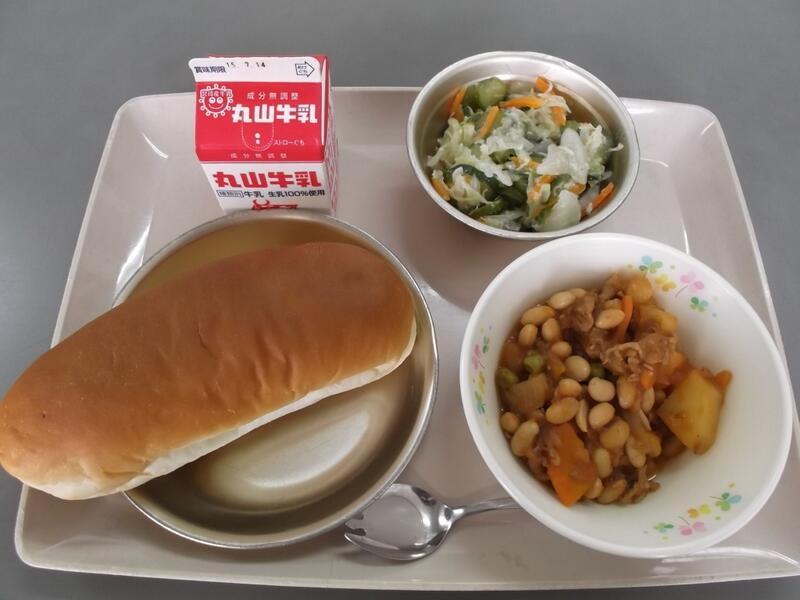 7月10日(金)献立:コッペパン 牛乳 カボチャのミートソース やさいスープ