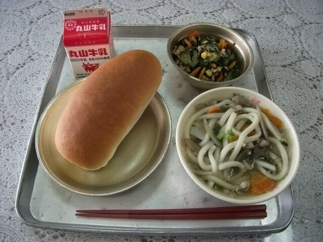4月28日(火)献立:げんりょうコッペパン 牛乳 ごもくうどん ひじきサラダ