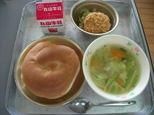 5月8日(金)献立:メンチカツバーガー 牛乳 やさいコーンスープ