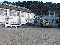 今日は、8時から、誉建設工業(2・4年生の保護者)の2名(児童の祖父、従業員)の方が、ショベルカーとダンプカーを借りてきてくださり、ボランティアで鉄棒のところや砂場など、運動場整備をしてくださいました。