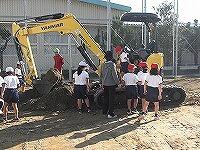 作業の休息中、ショベルカーに大はしゃぎの1年生でした。
