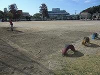 整備途中の土は、登り棒の下などに運びました。1年生が、体育で運動場にいたので、担任の先生に紹介し、楽しんでもらいました。