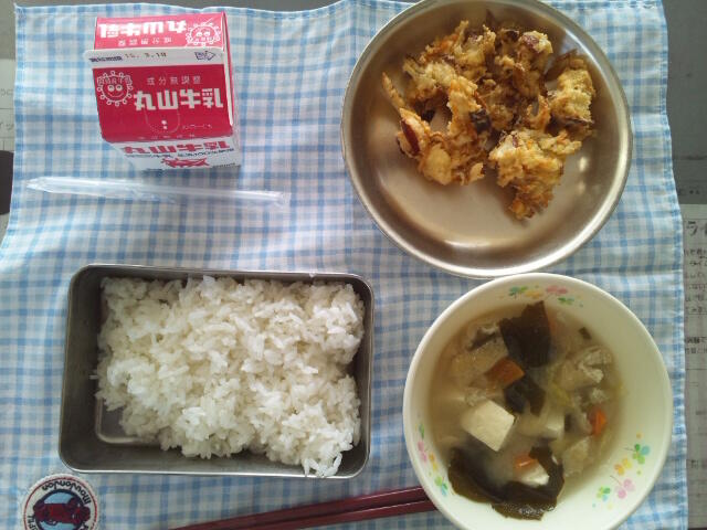 3月3日(木)献立:ごはん 牛乳 かきあげ ぐだくさんみそしる