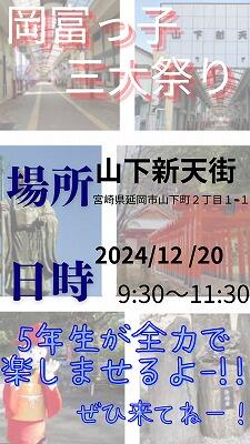 12月20日(金)、山下新天街において、本校5年生が「岡富っ子三大祭り」を行いました。この祭りは、地域の財(たから)である今山の寺社、山下新天街、徐福伝説について知り、そのすばらしさを楽しく広げようというコンセプトです。総合的な学習の時間を使い、1学期から準備を進めてきました。
