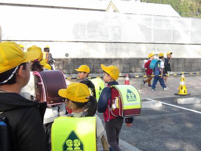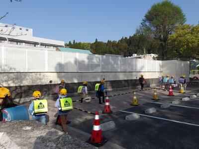 5月12日(月)に、地震・津波対応の避難訓練を行いました。事前に子供たちには避難の仕方や気をつけることなどの学習を行っていました。この日は運動場に一次避難した後、大津波警報発令を想定し、学校北側高台にあるマンション「プラウド北小路」さんまで全校で避難しました