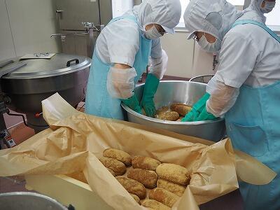 今日は、さばを使った揚げ物です。通常の魚のフライはパン粉を付けて揚げますが、パン粉を付けずに油で揚げて、その後タレをかけてパン粉をまぶすことから変わり揚げとよばれています。パン粉も事前に炒っておくことで香ばしい風味となり、子どもたちの大好きなソース味のタレとよく絡み合い、ごはんが進む一品となっています。