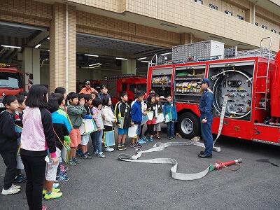 消防車の中にはたくさんの水が入っていることも学び、ホースをつなぐ所も見せていただきました。
