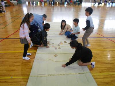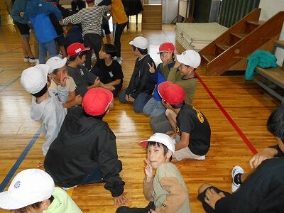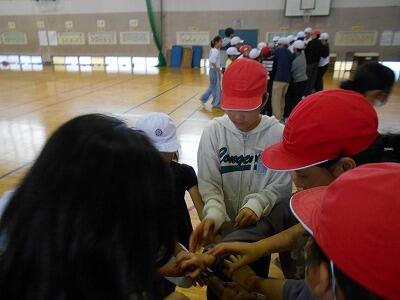 なかなか難しいのですが、さすがは3年生と6年生です、輪っかができているグループがいくつかありましたよ。座ってVサインをしているグループは成功しています。たぶん。