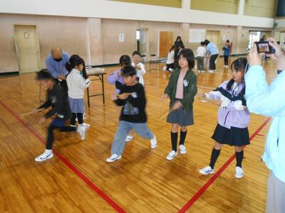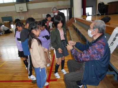 13日(木)、1年生は毎年恒例となった、地域の方との昔遊びを体験しました。岡富西・東地区社協の方々9名に来ていただき、それぞれコースに分かれて、2時間思い切り楽しみました。