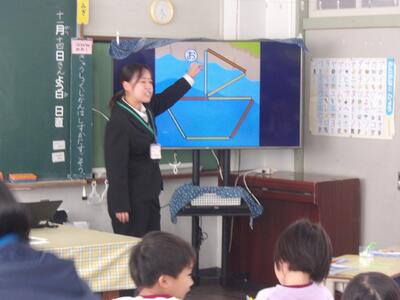 棒を使っていろいろな形作りに挑戦しました。椎葉先生の出すヒントが絶妙。「〇本で作ってみて」「ヒントをちらっと見せるよ」と言いながら、楽しそうに、魚やヨットなどの形をたくさん作っていました。