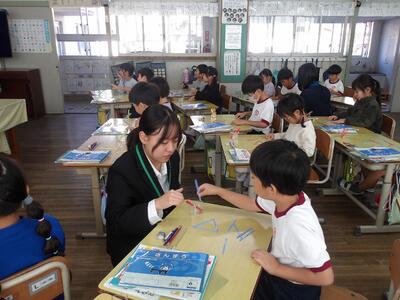川崎先生の「理由は?」「例えは?」等の問いかけに全員しっかり答えていました。たいしたものです。これも一つ一つの丁寧な説明や指示のたまものです。板書も丁寧で、すっきりわかりやすい授業でした。