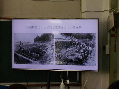 まずは、最初の謎、「なぜ昔は田を作ることができなかったのか?」については、川の写真を使って、分かりやすく説明していただきました。延岡の川をよく見ると、水面が地面よりもずいぶん下側にあるのが分かります。これでは、田に簡単に水を引くことができないのです。