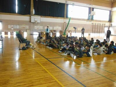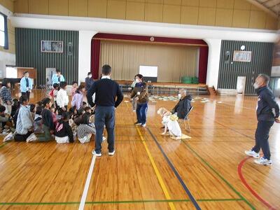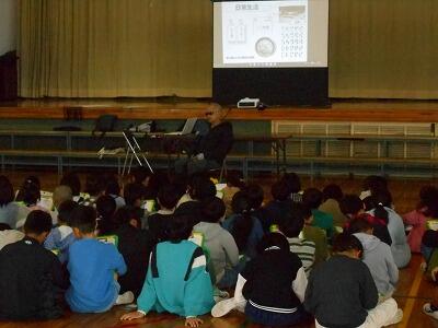 3年生の総合的な学習の時間のテーマは、「福祉」となっていますので、今年度も「盲導犬との交流会」を体育館で行っています。指導をお願いしているのは、九州盲導犬協会の後藤さん(盲導犬ユーザー)と福田さん(啓発ボランティア)です。