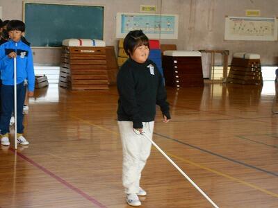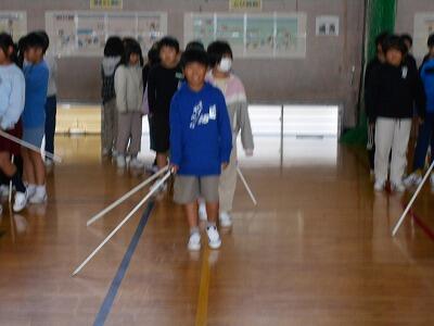 3年生のみんなや我々職員に少しでも目の不自由な方の気持ちを理解してもらおうということで、「白杖歩行体験」もしました。目の不自由な方は、白い杖を持って周囲の障害物や段差を確かめながら歩行します。盲導犬を連れていても、この白い杖は必要です。