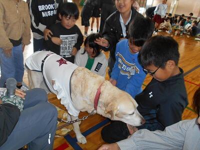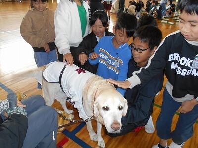 最後に、質問などが終わったら、盲導犬の玉露さんにさわることができました。モフモフのさわり心地に心も癒やされます。そして、いろんな人がさわっても常に穏やか表情です。3年生のみんなも優しい気持ちで玉露さんとふれあいました。