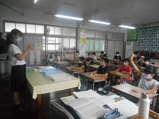 9月11日(金)、宮崎日日新聞社の延岡支社長が来校し、紙面の構成(新聞社名、発行日、見出し、記事、写真、コラム、広告)や文章構成等について、拡大された1面記事を使って、分かりやすく教えてくださいました。