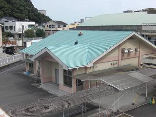 台風9号の影響で、給食室の一部に雨漏りが見つかりました。台風10号に備え、本日、急ピッチで作業が行われています。感謝です。