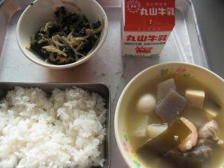 今日は、ごぼうについてのお話です。今日のお汁にはごぼうがたっぷり入っています。 ごぼうの生まれた所は、地中海沿岸から、西アジアにかけてで、日本には、平安時代に中国から伝わりました。はじめは、薬用として伝わったようですよ。ごぼうは、香りも良く、食物せんいが たっぷり入っていて、便秘予防に なります。ごぼうを使った料理は、きんぴらごぼう、煮しめ、たたきごぼう、揚げ物 などが あります。今日の給食のように、汁物にしても、香りが良くておいしいですよ。