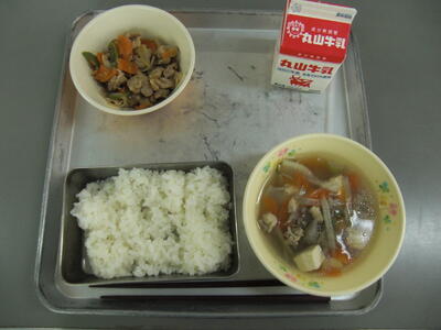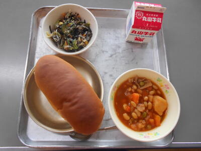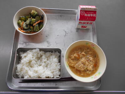 食生活をよくする合言葉、「まごはやさしい」をみなさんは知っていますか?みなさんにもっと食べてほしい、日本で昔から食べられてきた食品の頭の文字を並べたものです。「まめ、ごま、わかめ、野菜、魚、しいたけ、いも」です。これらの食品は、栄養的に優れているばかりでなく、かみごたえもある食品です。今日の給食には、まめ、ごま、野菜、しいたけが入っています。日本に昔から伝わる食事を大切にしていきたいですね。